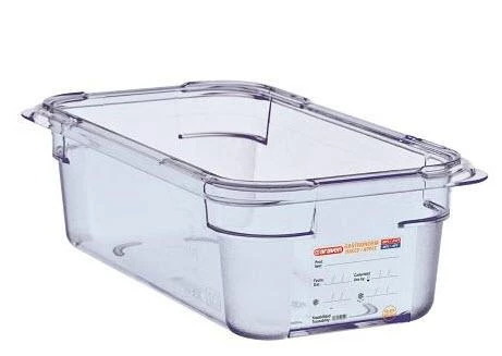 The GN 1/3 h100mm – 4″ 3.7l./ 3,17 qt without lid –Â airtight containers BPA Free are conceived and designed for catering professionals. The GastroNorm size containers have integrated traceability labels, they help comply with the health and hygiene regulation, they are totally transparent to quickly identify the food they contain. Their bi-injection moulded lid with rubber seal ensures maximum protection of foodstuff even in large containers.Â