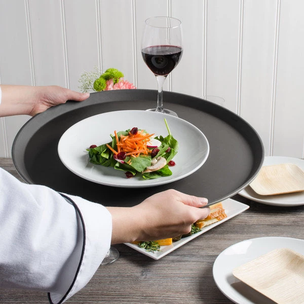 Keep drinks and meals in place during transport with this Cambro 1800CT110 Camtread® 18″ round black non-skid serving tray! Its features a sturdy, functional design, complete with a durable fiberglass construction to handle heavy weight loads. This tray also features a thick non-skid surface that will give your wait staff peace of mind when navigating a busy restaurant with an order full of drinks and food.