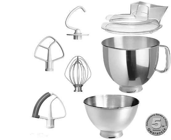 STANDARD ACCESSORIES: 4.8 L Bowl, 3 L Bowl, Pouring Shield, 6-Wire Whip, Flat Beater, Flex edge beater, Dough Hook