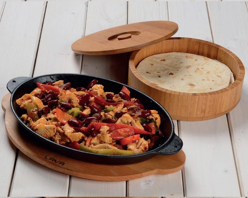 Description: Fajita Plate, Oval, Integral metal handles and wooden platter.