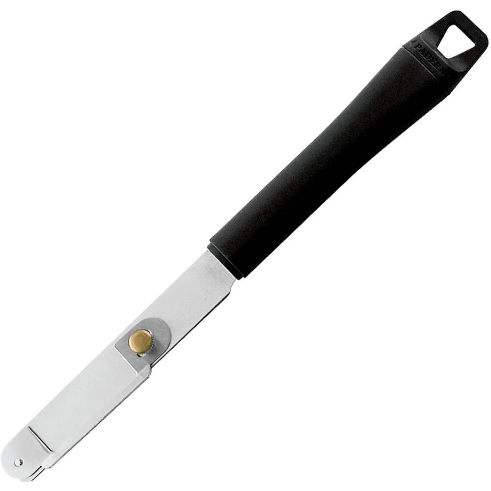 The heavy-duty stainless steel Paderno tool with its sharp cutting blade is perfect for peeling asparagus. The handle is made of dishwasher-safe plastic while the blade is constructed of stainless steel.