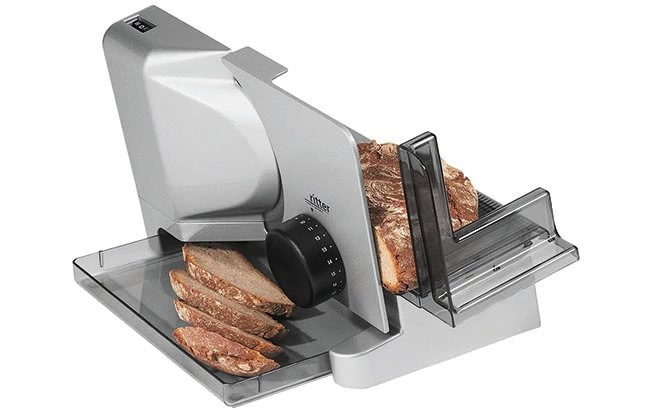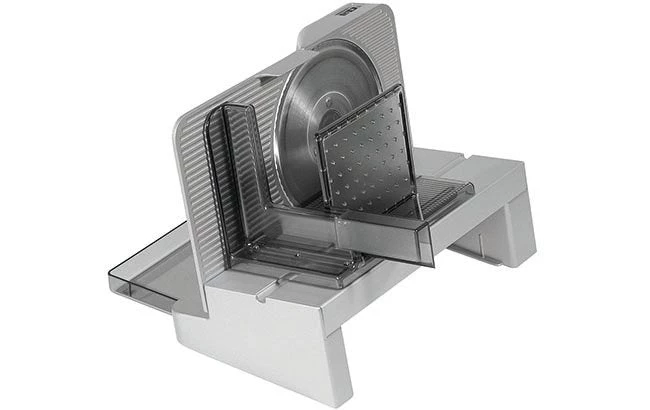 The food slicer is equipped with a special serrated circular blade, a switch for intermittent and continuous operation, a food tray and cable compartment.