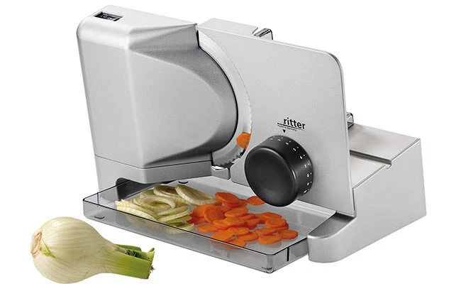 The inclined housing is advantageous when cutting thin and large slices.