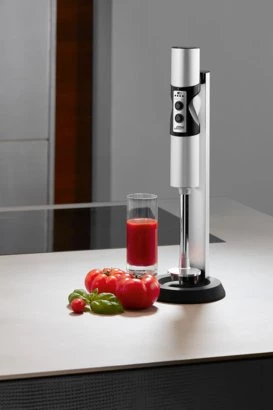 Even safety is an important topic: It has a two-finger switch-on safety system. The unlock and on buttons must be pushed at the same time to prevent them from switching on accidentally. The hand mixer spins at a maximum speed of 12.000 rpm. Thanks to the switching system, two lower speed levels can then be chosen. To protect from overloading, for example if the blade is blocked, or overheating, the appliance shuts itself off automatically.