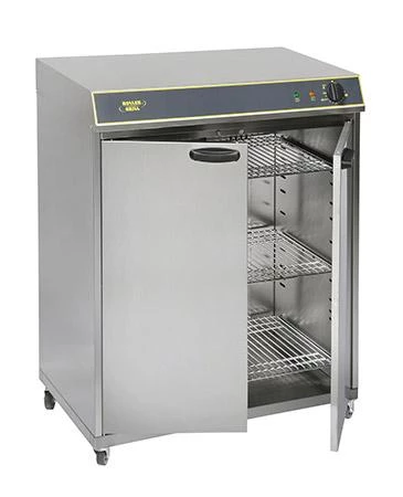 Features: stainless steel interior, thermostat 130 ° C, thermo-fan for perfect spread of the heat, double insulation of the walls and roof, doors with magnetic closure. Delivered with 3 grids, without GN tray. Enamelled tray. Adjustable shelves. 4 wheels with brake systems.