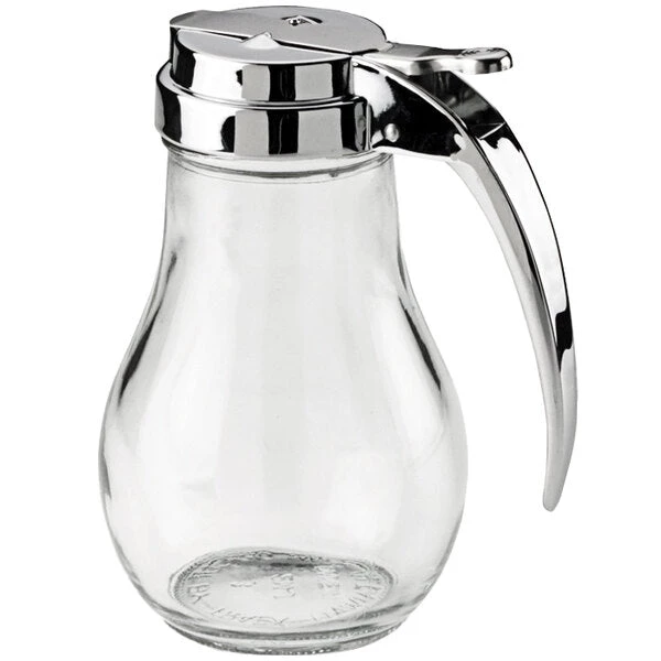 Boost your foodservice operation by using this Vollrath 214 Traex® Dripcut® 14 oz. clear glass syrup server with chrome-plated top. Perfect for dispensing syrups, dressings, or signature sauces, this item is a versatile addition to any busy restaurant, bar, diner, or buffet. It features a crystal-clear glass construction that offers an upscale look and feel while enabling excellent product visibility and fast identification of contents. Its convenient 14 oz. capacity is great for self-service stations or tabletop use as well, keeping guests in ample supply of what they require.
