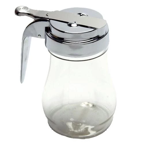 “DRIPCUT SYRUP POURER, 7 OZ, CLEAR POLYCARBONATE JAR WITH CHROME TOP, 4-1/4″H(10.8CM), 2-3/4″(7CM) BOTTOM DIA, 1-5/8″(4.1CM) JAR OPENING”