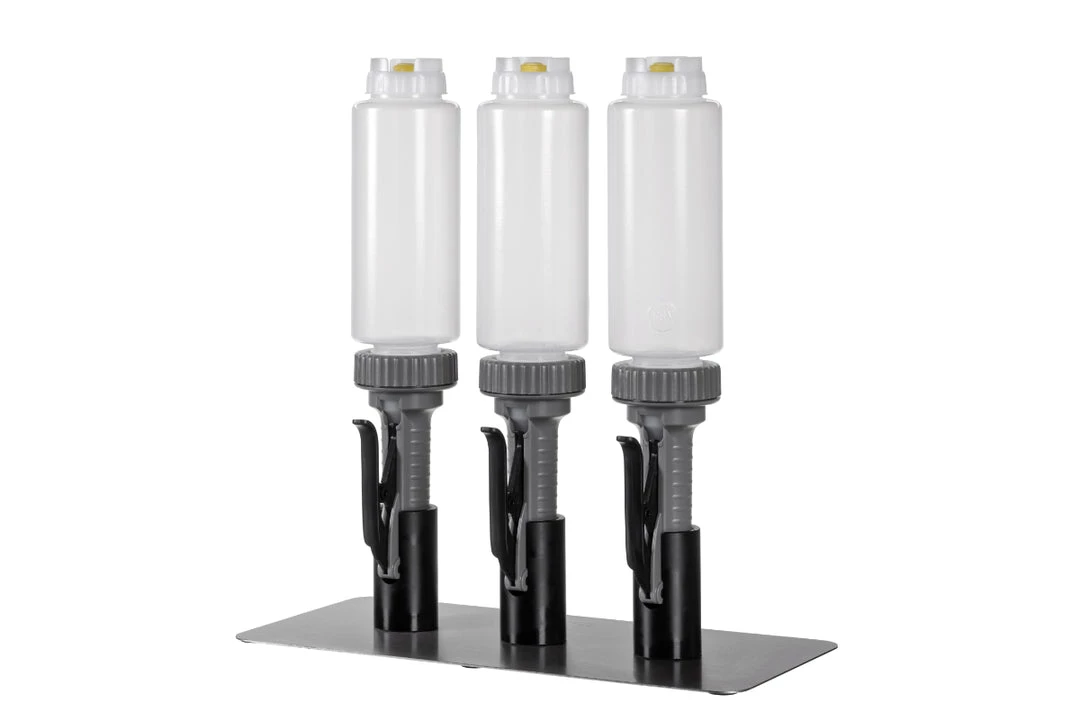 The Ultimate Portion Fifo Dispenser Set for refillable bottles is available for 2 and 3 Fifo bottles and is delivered as a complete set, including the stainless steel base plate / stand, FIFO adapters, FIFO bottles, gun holsters and the Ultimate Portion Dispenser guns. The Fifo bottles have a volume of 710ml.