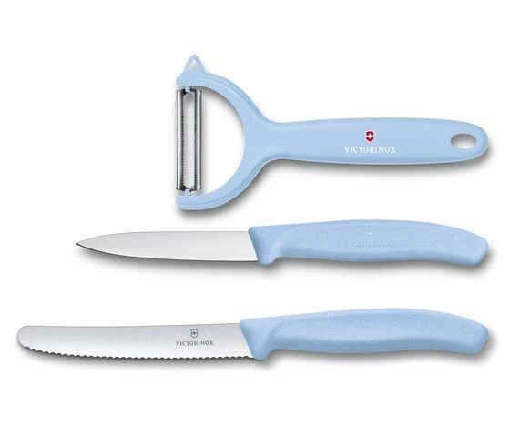 - Contains 8 cm straight edge Swiss Classic Paring Knife, 11 cm wavy edge Swiss Classic Tomato Knife and Swiss Classic Tomato and Kiwi Peeler crafted in the finest quality stainless steel with ergonomic handles